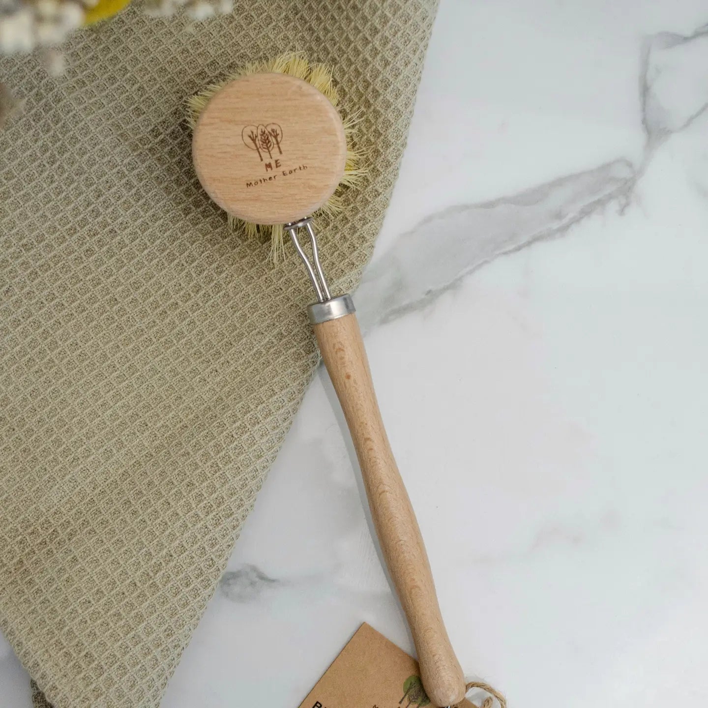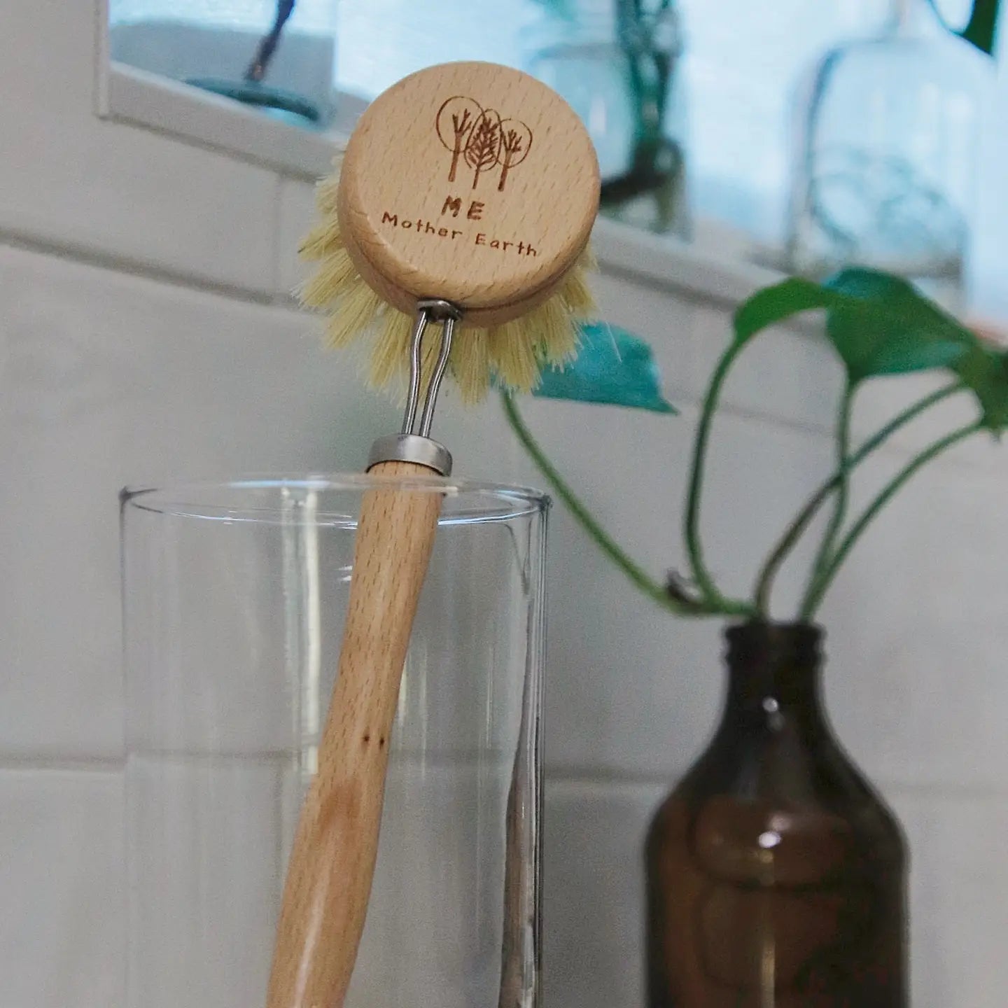 our 100% biodegradable beechwood and sisal fiber dish brush. The head is removable and replaceable. Our kitchen brush has a beechwood handle with sisal fiber (agave plant) bristles. Minimally fastened together with a metal wire & metal loop to hang to dry.