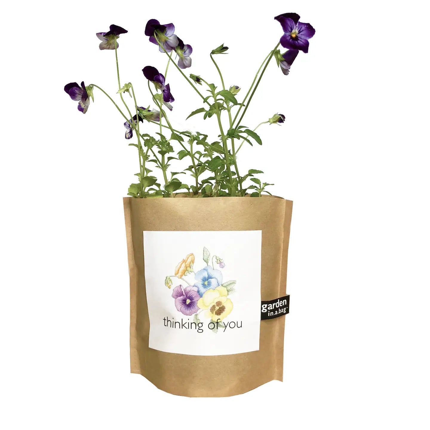 Thinking of You {Pansy, Viola wittrockiana} The name Pansy comes from the French word Pensée which means thought. A reminder in bloom that someone is thinking of you. Pansies are hearty plants and easy to grow. The large blooms will brighten any windowsill. The flowers are not only beautiful but also edible and can add color to a salad or can be a candied accent to cakes. Complete to grow kit in a leak proof bag.