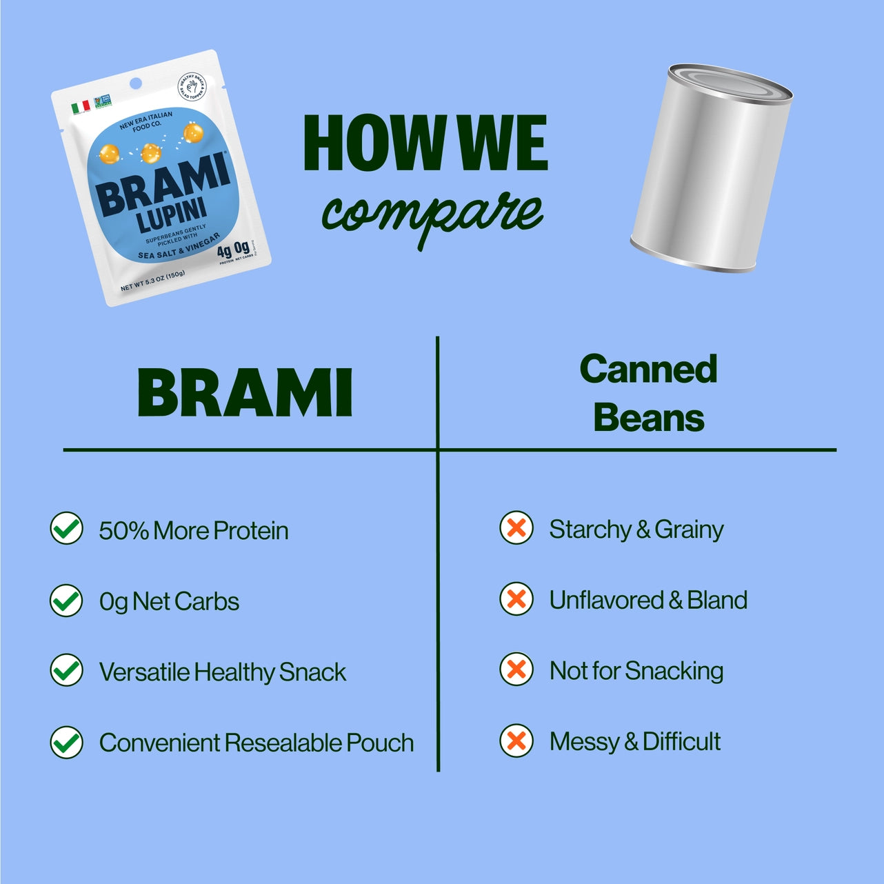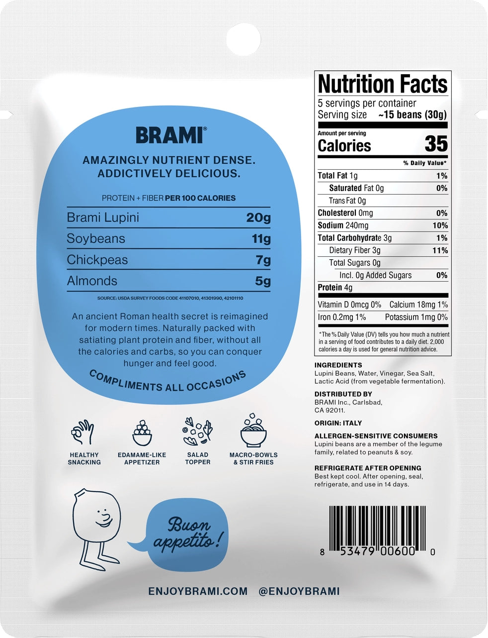 Known as lupini in Italy, BRAMI is a lightly pickled legume snack that is incredibly nutritious and deliciously addicting. 150g. THE MEDITERRANEAN ANSWER TO EDAMAME: Lupini Beans have been a popular appetizer since Ancient Rome CONQUER HUNGER: Packed with plant protein & fiber to satisfy; 50% more protein than chickpeas FEEL GOOD: BRAMI won't compromise your diet or leave you sluggish; 35 calories & 0g net carbs SIMPLY PICKLED: Not baked, fried, or dried - it's simply a pickled vegetable snack DIET-FRIENDLY: Vegan, keto, paleo, gluten-free, grain-free, diabetic, dairy-free and soy-free