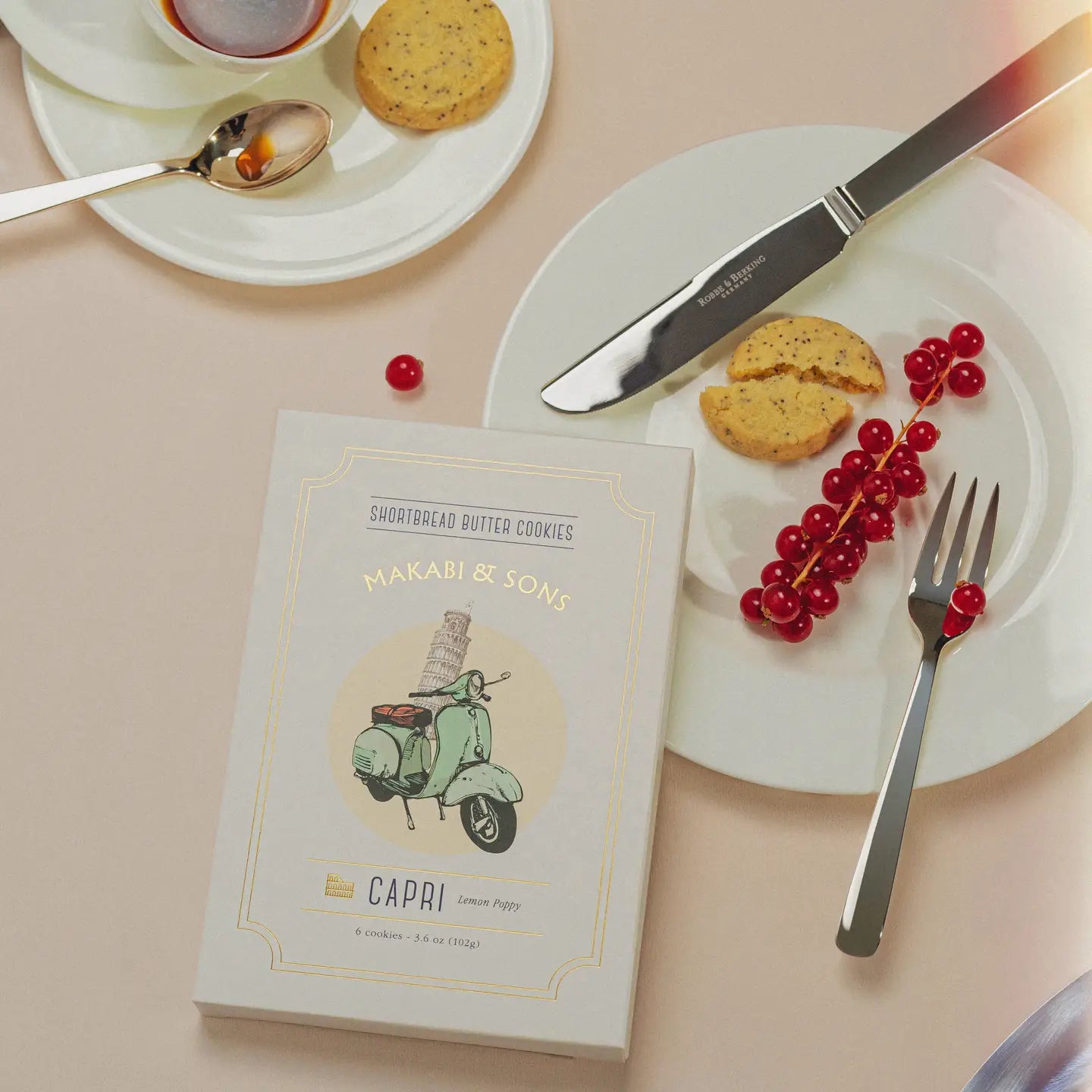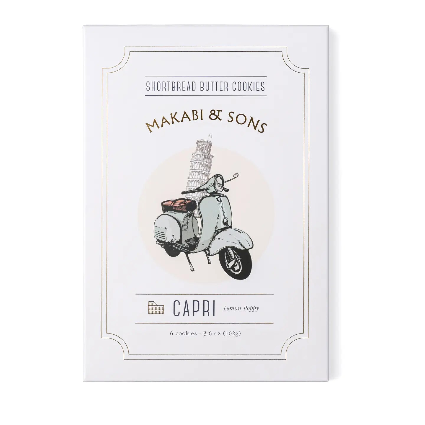 Shortbread butter cookies with bright lemon oil and crunchy poppy seeds. Secret pergolas and lemon groves in the back gardens of the Amalfi coast. Sinuous lanes lead to cliff-edge villas dripping with bougainvillea. Citrus concoctions make love to poppy fields. Summer’s escape along the coast. 3.6oz (6 cookies per box)