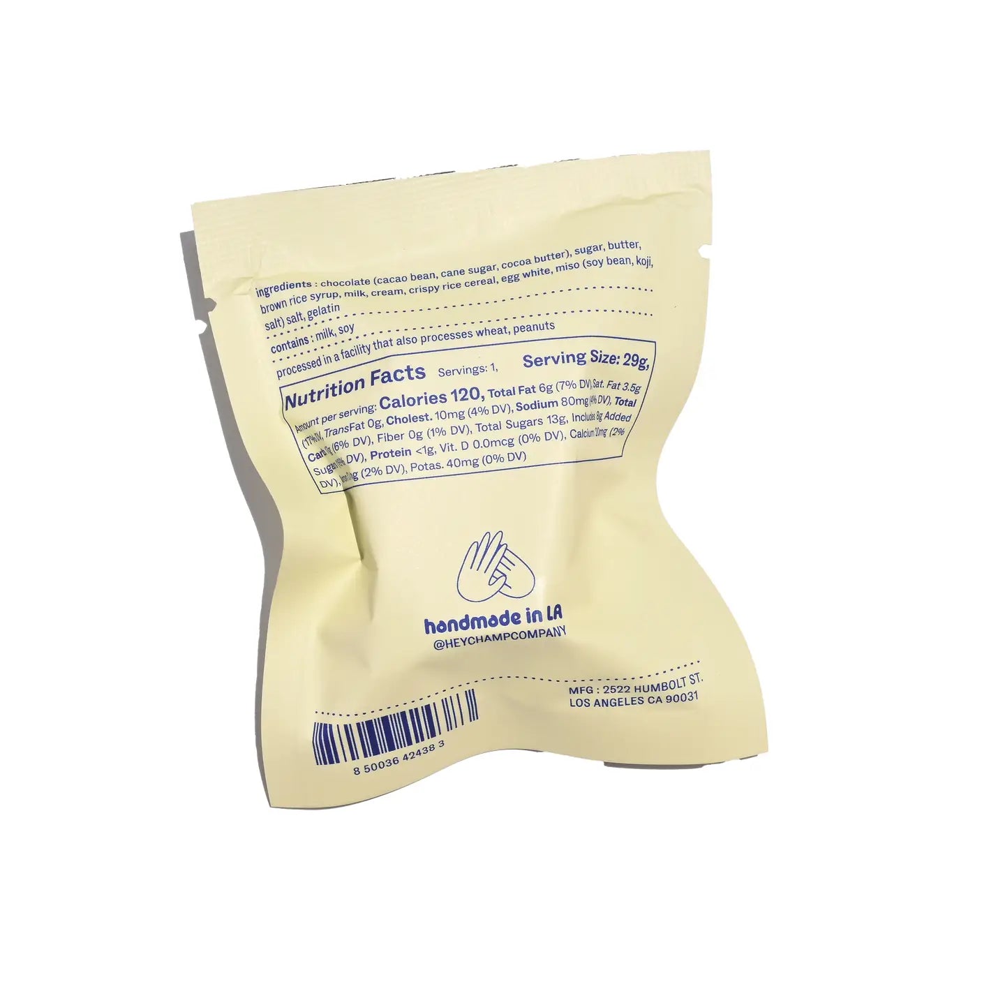 Ingredients: chocolate (cacao bean, cane sugar, cocoa butter), sugar, butter, brown rice syrup, milk, cream, crispy rice cereal, egg white, miso (soy bean, koji, salt) salt, coconut oil, gelatin