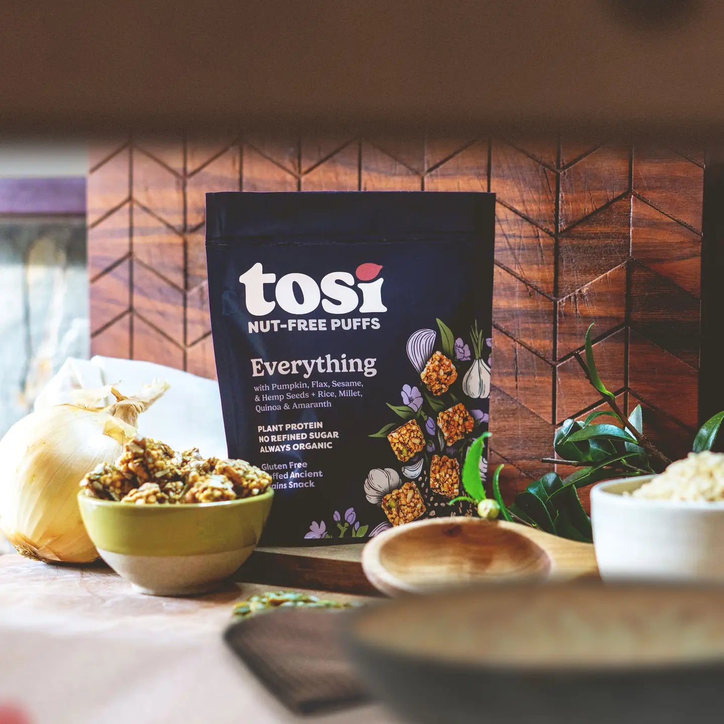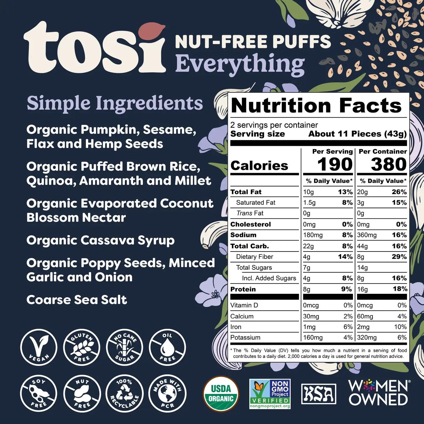 Ingredients: Pumpkin Seeds*, Cassava Syrup*, Evaporated Coconut Blossom Nectar*, Sesame Seeds*, Flaxseeds*, Everything Seasoning (Sea salt, poppy seeds*, minced garlic*, minced onion*, sesame seeds*), Puffed Brown Rice*, Puffed Quinoa*, Hemp Seeds*, Puffed Amaranth*, Puffed Millet*, Sea Salt. *Organic
