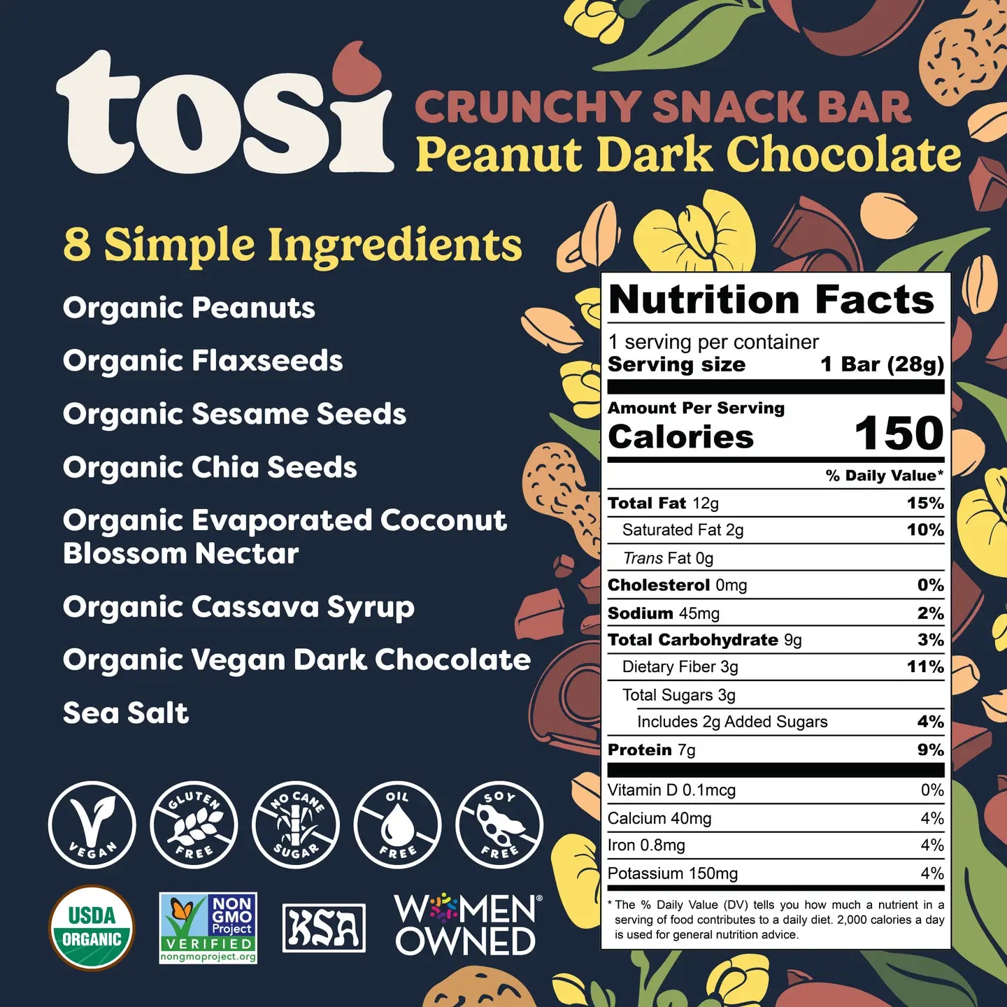 Ingredients: Peanuts*, Seed Blend (Flaxseeds*, Sesame Seeds*, Chia Seeds*), Cassava Syrup*, Unsweetened Chocolate*, Evaporated Coconut Blossom Nectar*, Sea Salt. *Organic