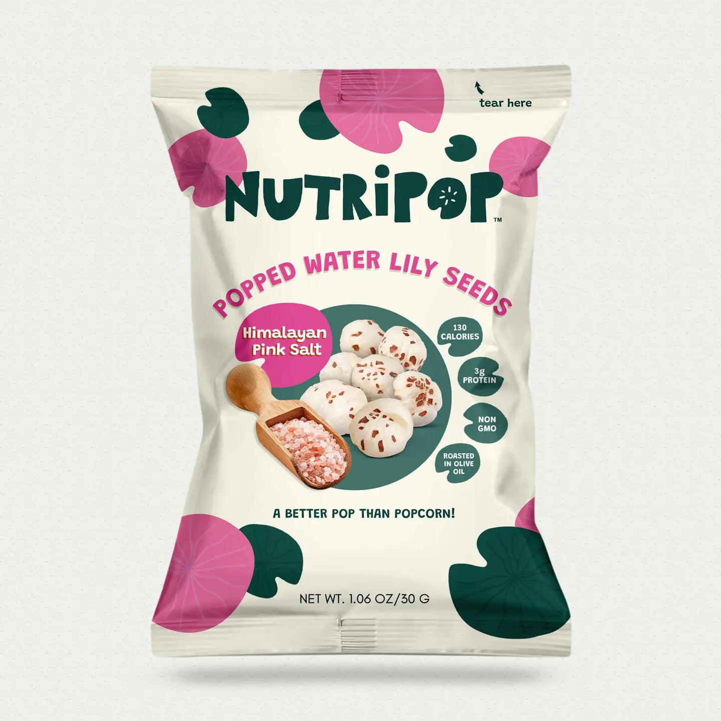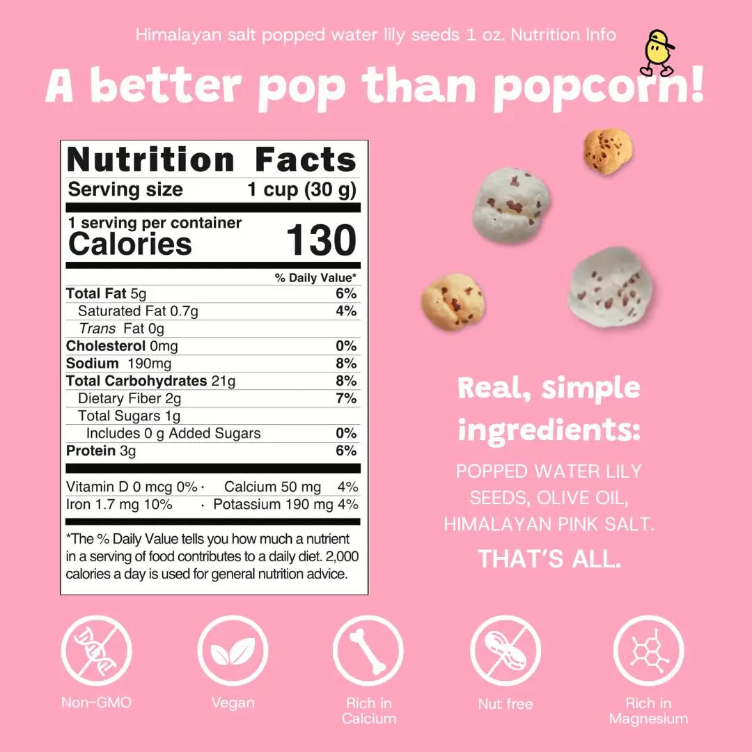 NutriPop is a roasted popped water lily seed snack that eats like light, airy popcorn without the grease or kernels. Our Himalayan Pink Salt flavor is the OG of mindful snacking. Just three simple ingredients and a craveable savory crunch.Β
