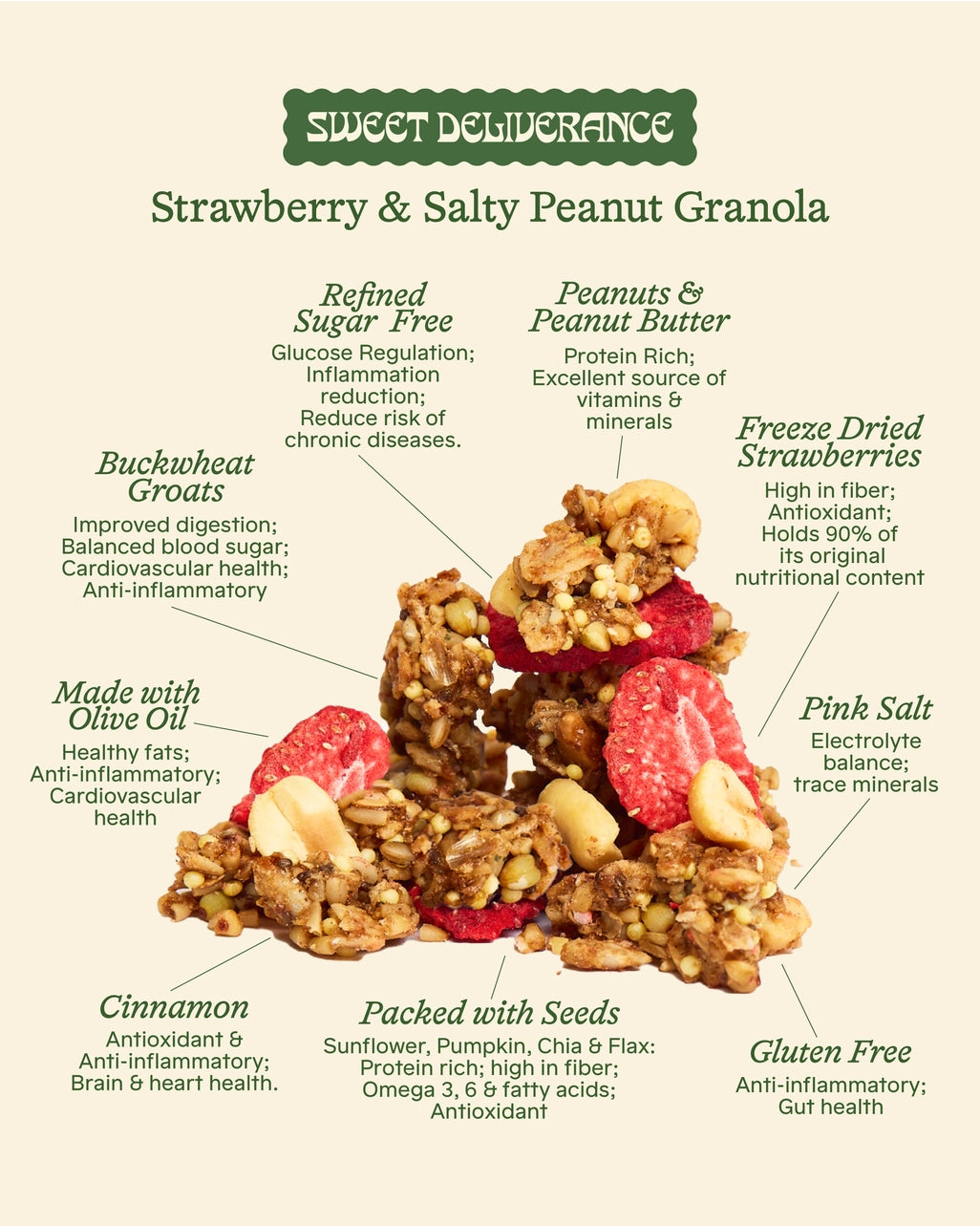 Ingredients: *Gluten Free Rolled Oats, *Steel Cut Oats, *Peanuts, *Millet, *Maple Syrup, *Coconut Sugar, *Buckwheat Groats, *Sunflower Seeds, *Pumpkin Seeds, *Peanut Butter, *Extra Virgin Olive Oil, *Chia Seeds, *Flax Seeds, *Hemp Seeds, Dried Strawberries, *Pink Salt, *Freeze-Dried Strawberries, *Cinnamon (*Organic Ingredients)